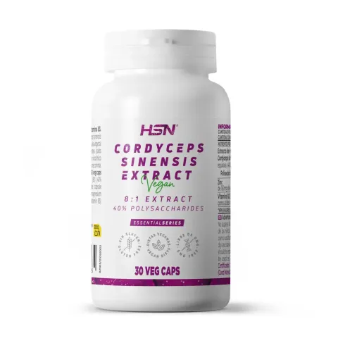 Cordyceps-Extrakt (8:1) 500 mg von EssentialSeries ist ein veganes Nahrungsergänzungsmittel in Kapseln, basierend auf Myzelextrakt des Pilzes Cordyceps sinensis, standardisiert auf 40 % Polysaccharide, Zink und Vitamin B3.