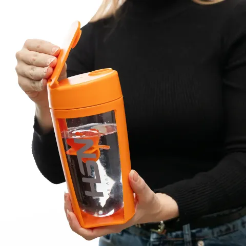 Durchsichtiger Shaker mit orangefarbener Beschichtung. Der Mischball vermeidet das Bilden von Klumpen in deinen Getränken. Mit grauem HSN-Logo auf der Vorderseite. Hochwertiger BPA-freier Kunststoff.