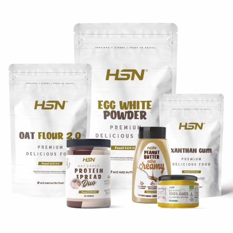 Komplettes Set zur Zubereitung von hausgemachten Waffeln: 1 kg Instant-Hafermehl, 2 kg Eiklarpulver, 150 g Xanthan, 1 extra cremige Butter nach Wahl, 300 g Duo-Creme aus Kakao und Haselnüssen sowie 200 g Bio-Ghee.