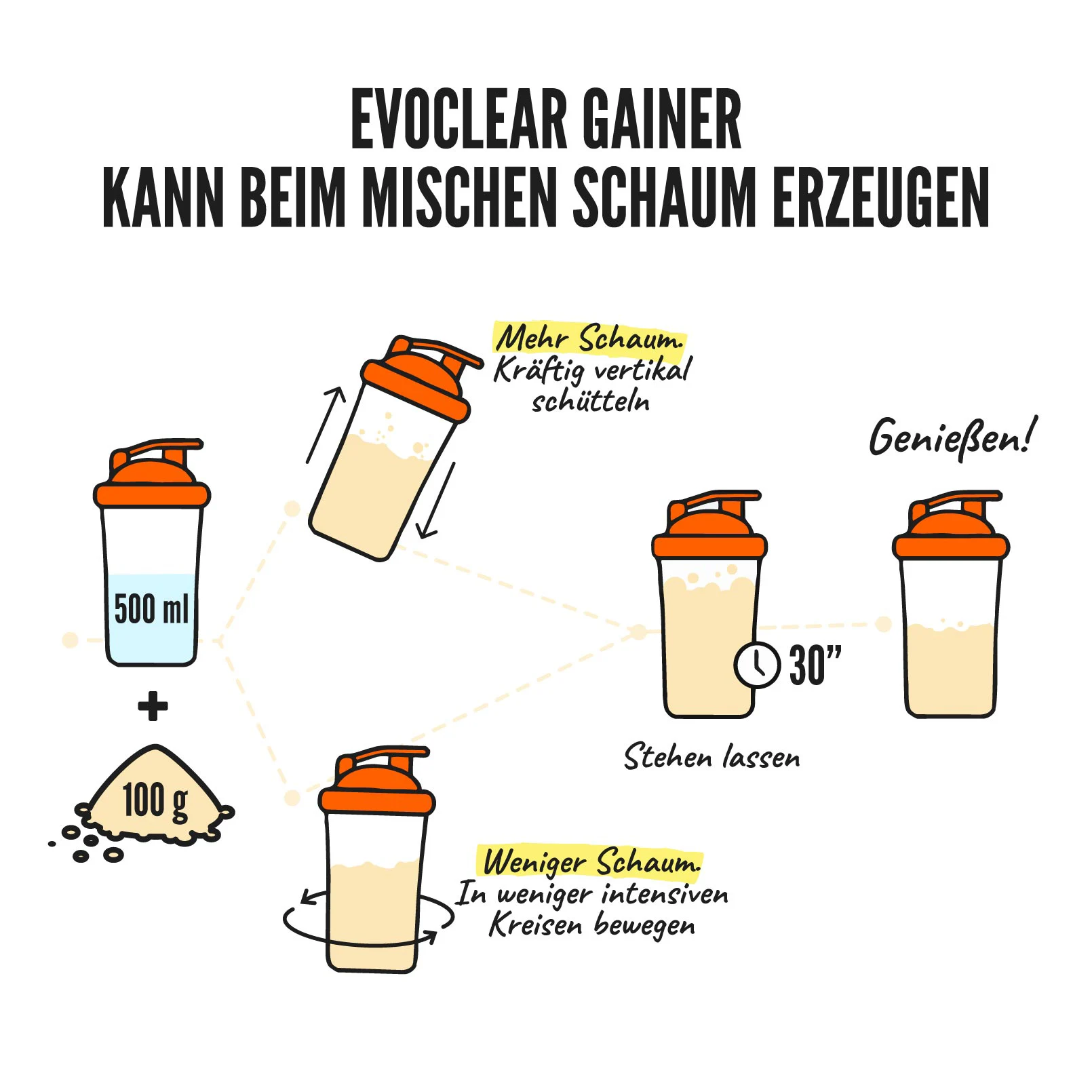 Evoclear Gainer kann beim kräftigen Schütteln im Shaker schäumen, da die Interaktion von Protein und Kohlenhydraten Luft einschließt.