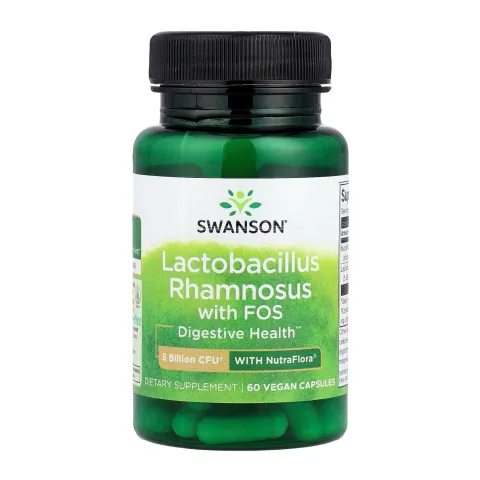Lactobacillus Rhamnosus mit FOS 5 Milliarden CFU von Swanson ist ein Nahrungsergänzungsmittel, das aus Lactobacillus Rhamnosus mit Fructooligosacchariden (FOS) in pflanzlichen Kapseln besteht.