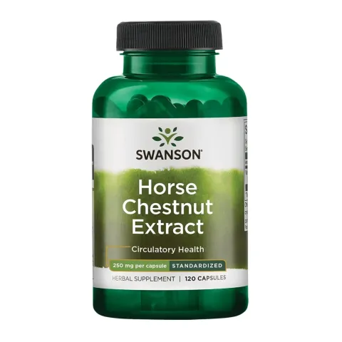 Rosskastanienextrakt 250 mg von Swanson ist ein Nahrungsergänzungsmittel in Kapseln, hergestellt mit einem Rosskastaniensamenextrakt (Aesculus hippocastanum), standardisiert auf Aescin, einer für die Pflanze charakteristischen Mischung aus Saponinen, die die Qualität des Nahrungsergänzungsmittels kennzeichnet.