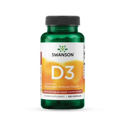 Vitamin D3 2000 IE von Swanson ist ein Nahrungsergänzungsmittel in Kapseln auf Basis von Colecalciferol (Vitamin D3).