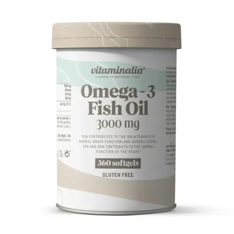 Omega-3 3000 mg von Vitaminalia ist ein Nahrungsergänzungsmittel in Weichkapseln auf Basis von Fischöl, standardisiert an Omega-3-Fettsäuren, 18 % EPA (Eicosapentaensäure) und DHA (Docosahexaensäure).